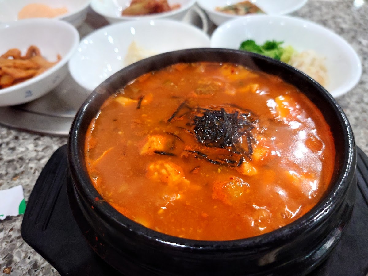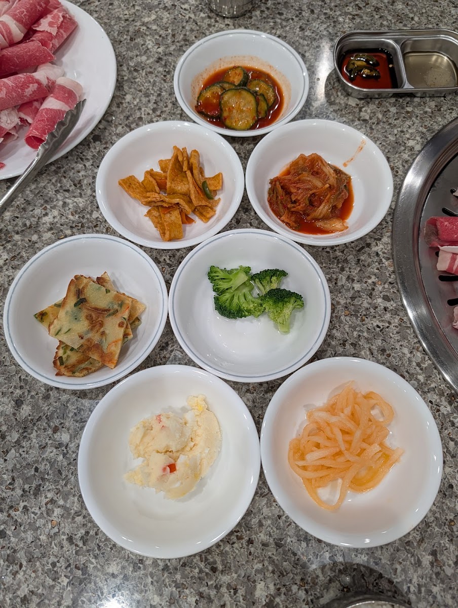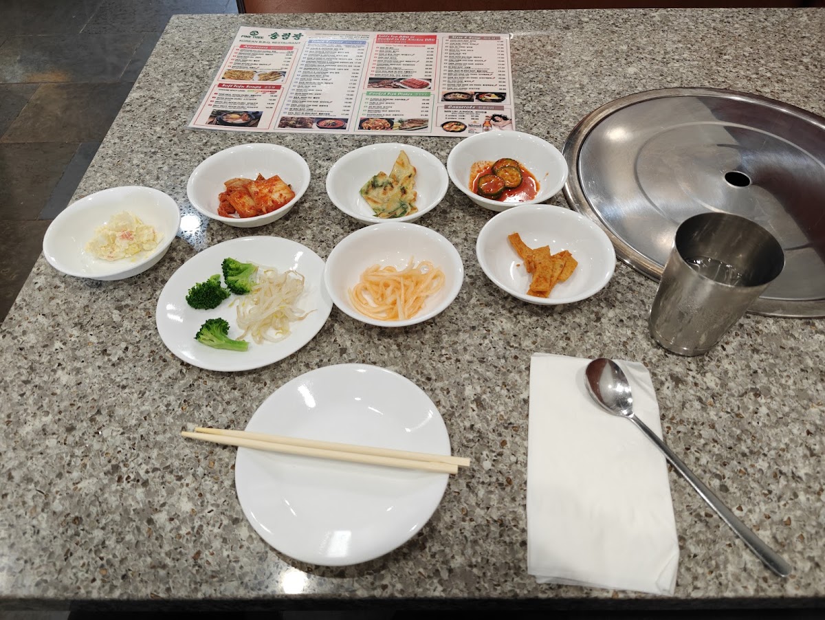 This is a nice table cookery Korean restaurant. I had a delicious spicy (mildly so) pork entree called Dae Ji Bul Kuki with 6+ banchan (side dishes), soup, salad and a rice bowl. There was a lot of food on the table.